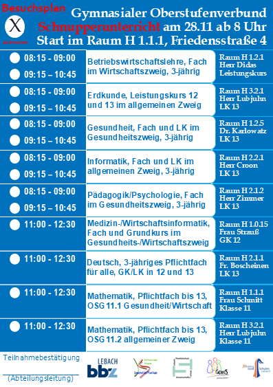 • Oberstufengymnasium: Friedensstraße 4, Start im Raum H 1.1.1