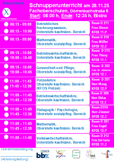 Den konkreten Besuchsplan https://www.bbzlebach.de/ sowie weitere Informationen zu den Schulformen finden Sie auch auf unserer Homepage unter „informieren“ https://www.bbzlebach.de/informieren/allgemeines-abitur/